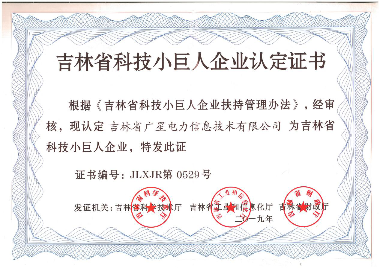 2019 年廣星智聯(lián)榮獲2019年度吉林省科技小巨人企業(yè)認(rèn)證證書榮譽(yù)
